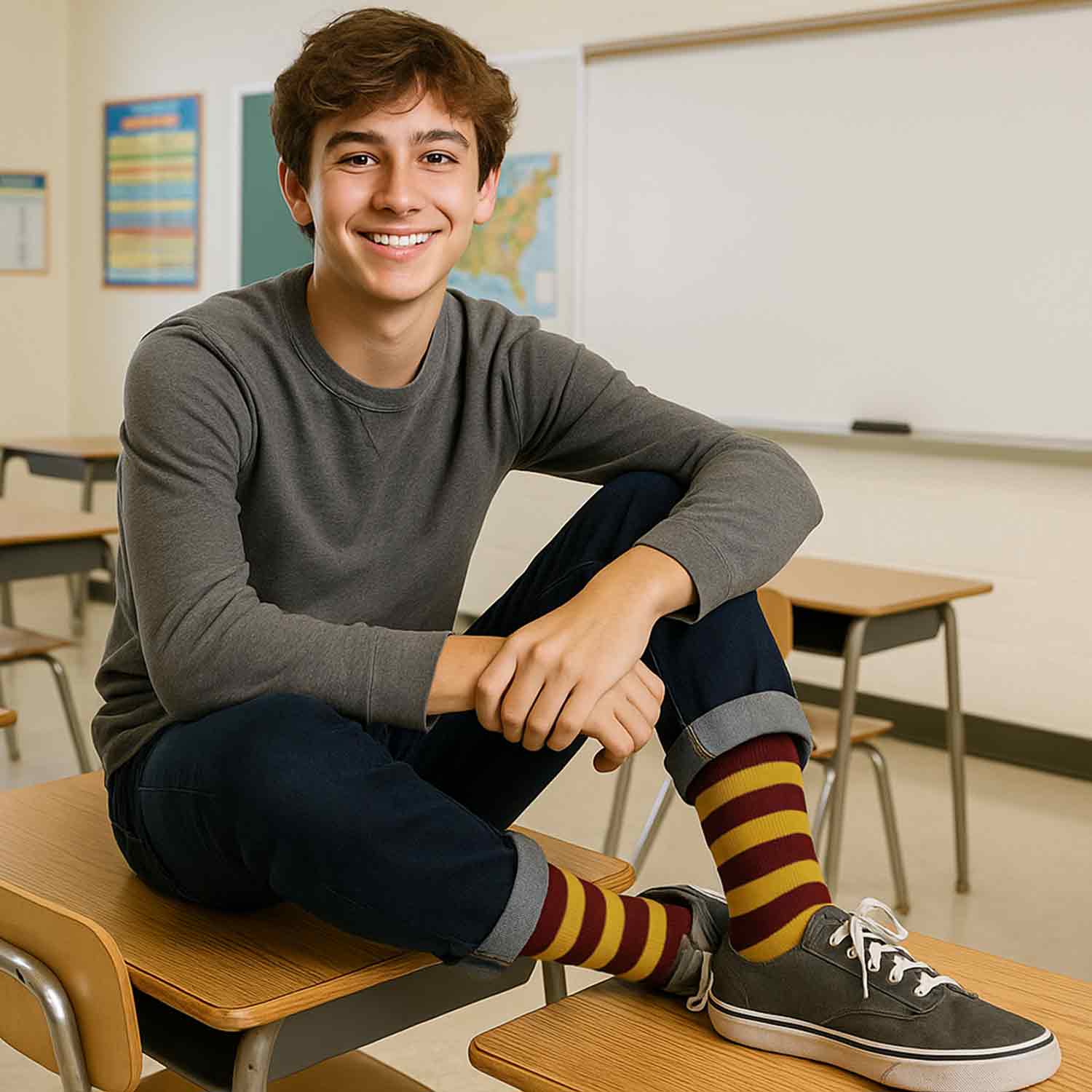 For a matching look, pair these socks with our maroon and gold striped ties. The socks feature a slightly smaller stripe than the ties at 0.5-inches wide. Please note that due to differences in materials, our socks are designed to coordinate with our maroon and gold ties but may not be an exact match.