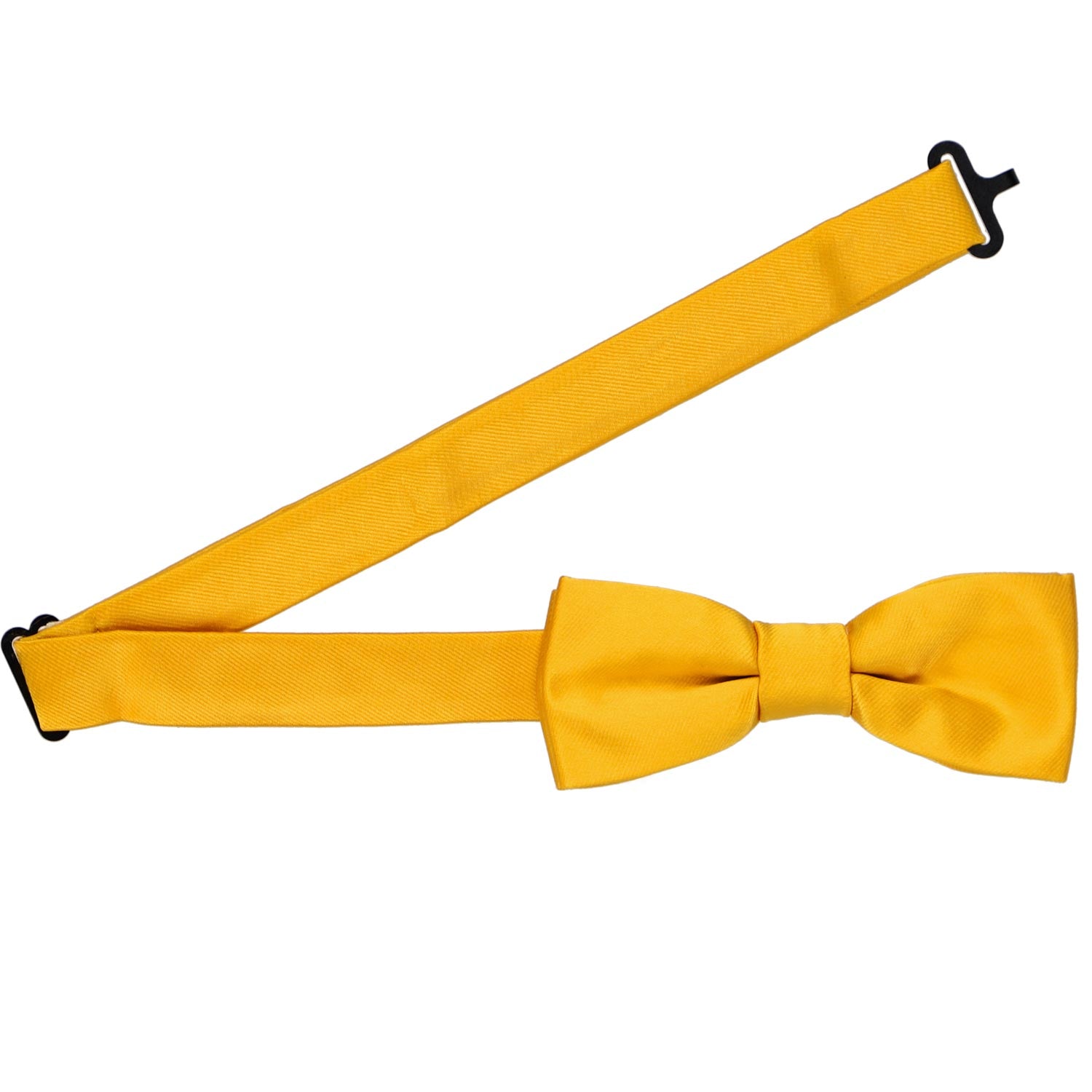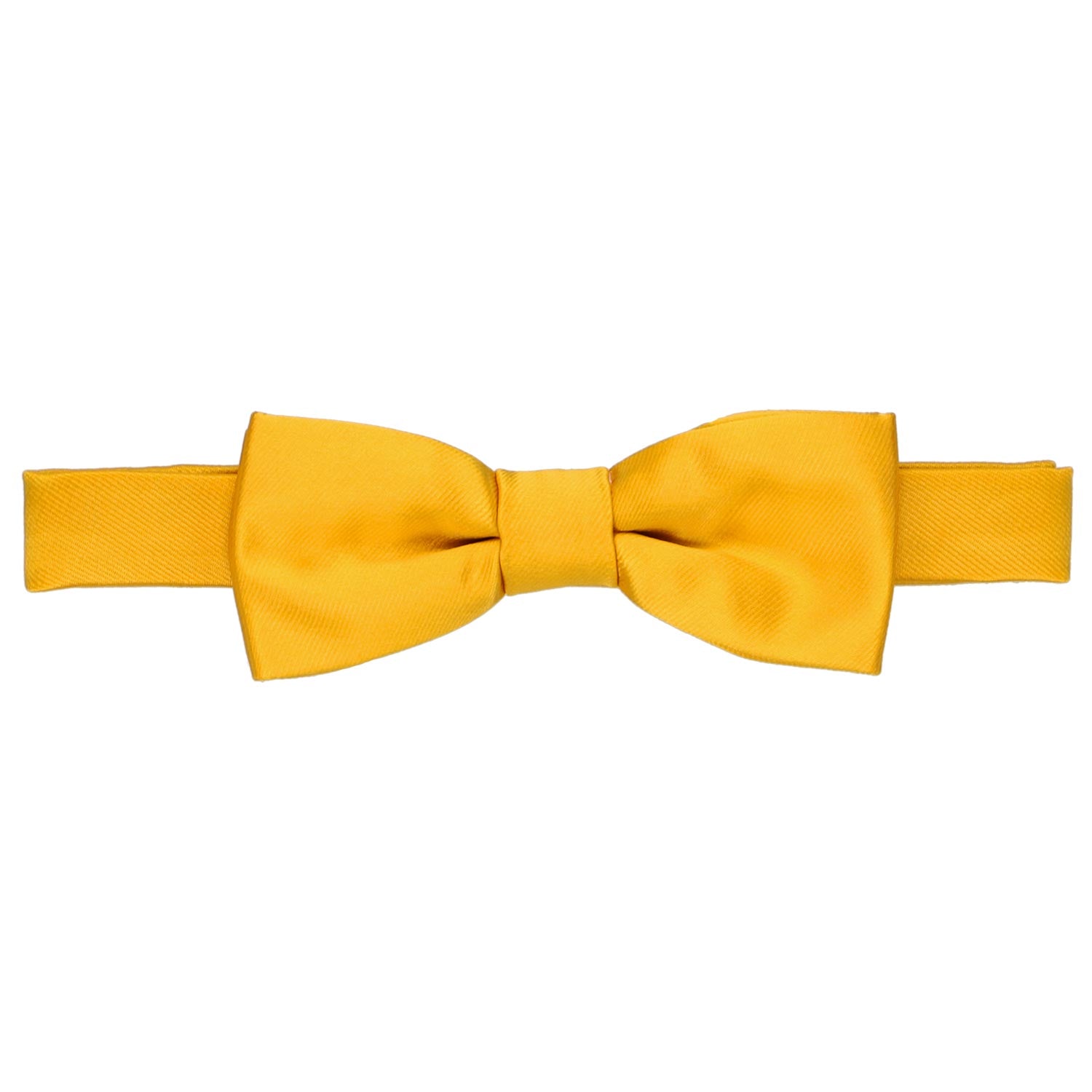A charming boys' golden yellow bow tie sized just right for your little guy. Made from heavyweight woven material with slight ribbing. The bow tie is pre-tied and features a safe and easy-to-use hook-and-eye closure. Measuring 4-inches across and 1.5-inches tall, this boys' bow tie is sized for boys from baby to 10-years old.