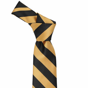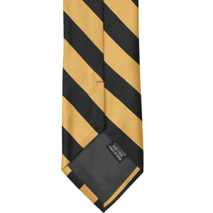 This honey gold and black striped tie provides a subtle color combo that is popular for stylish everyday attire. The classic 0.75-inch stripes are the perfect width for getting noticed without being overwhelming. Add it to a black suit for a dashing formal look or use it to match company colors as part of a button-down shirt and slacks uniform.