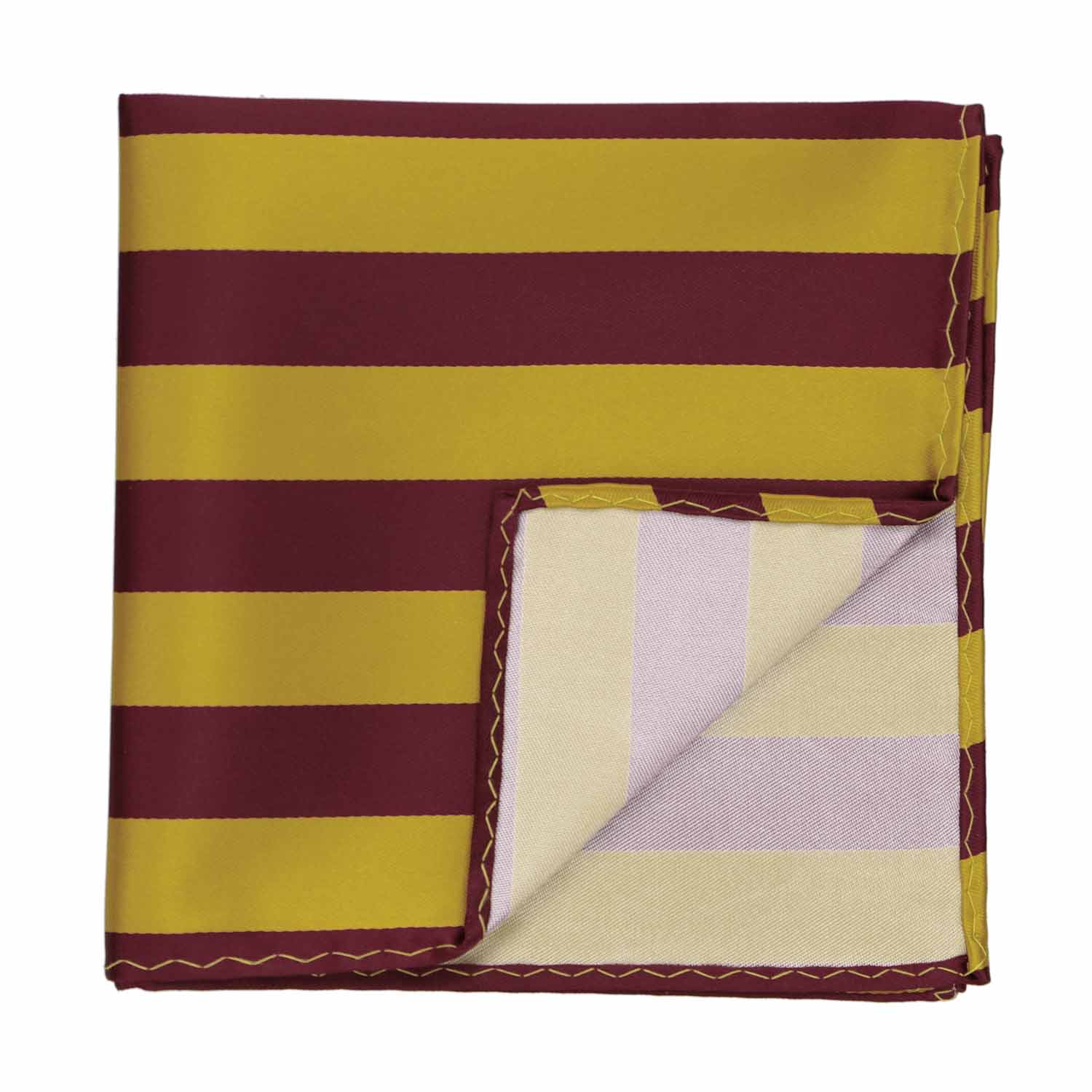 This maroon and gold striped pocket square measures a large, 12-inches by 12-inches to suit a wide variety of folds. The tightly woven material creates a smooth finish for a sharp look. Matches our maroon and gold striped ties, bow ties and more.