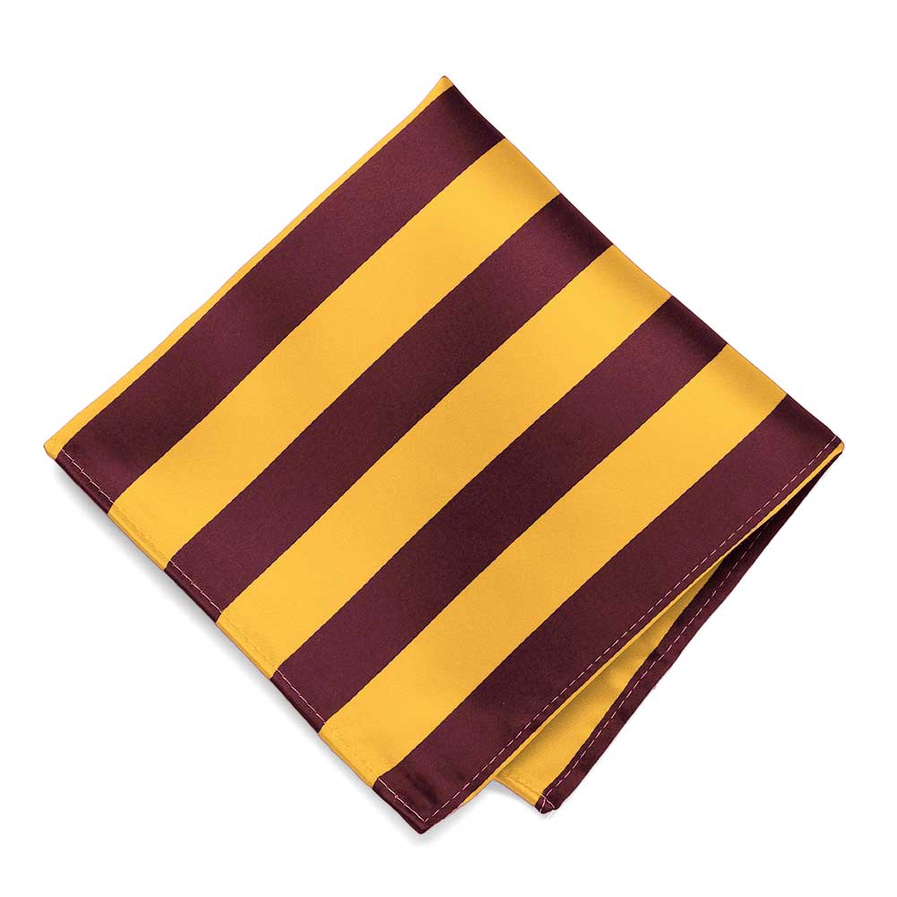 This maroon and golden yellow striped pocket square measures a large, 12-inches by 12-inches to suit a wide variety of folds. The tightly woven material creates a smooth finish for a sharp look. Matching ties, bow ties and more available for purchase.