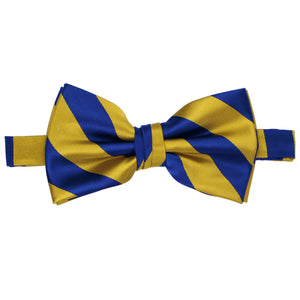This royal blue and gold striped bow tie features a pre-tied, band collar that expands to fit neck sizes up to 19-inches. Made from all polyester microfiber, it is designed to match our bestselling men's royal blue and gold striped ties and skinny ties. Matching pocket squares are available for purchase.