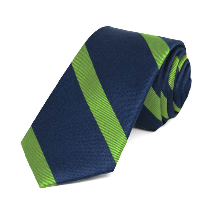 Navy Blue and Grass Green Striped Cotton/Silk Slim Necktie, 2.5" Width