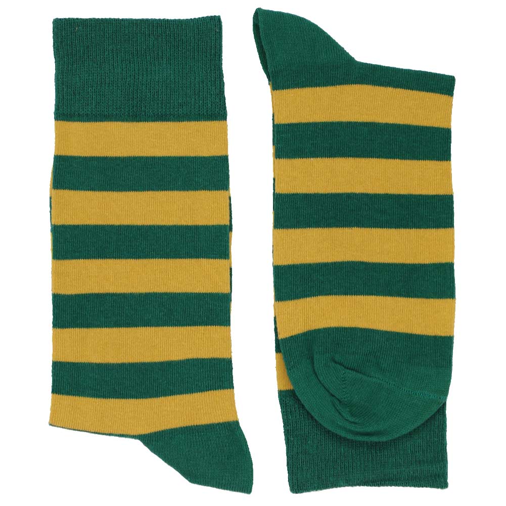 Show off your school, company or sports team colors with this fun pair of hunter green and gold striped dress socks. These men's socks feature 0.5-inch wide horizontal stripes. Wear these striped socks in a business setting or with your everyday looks.