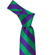 The front of a kelly green and dark purple striped tie, laid out flat