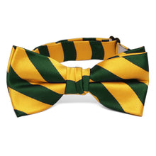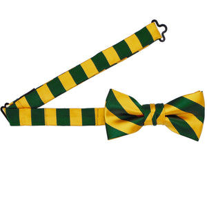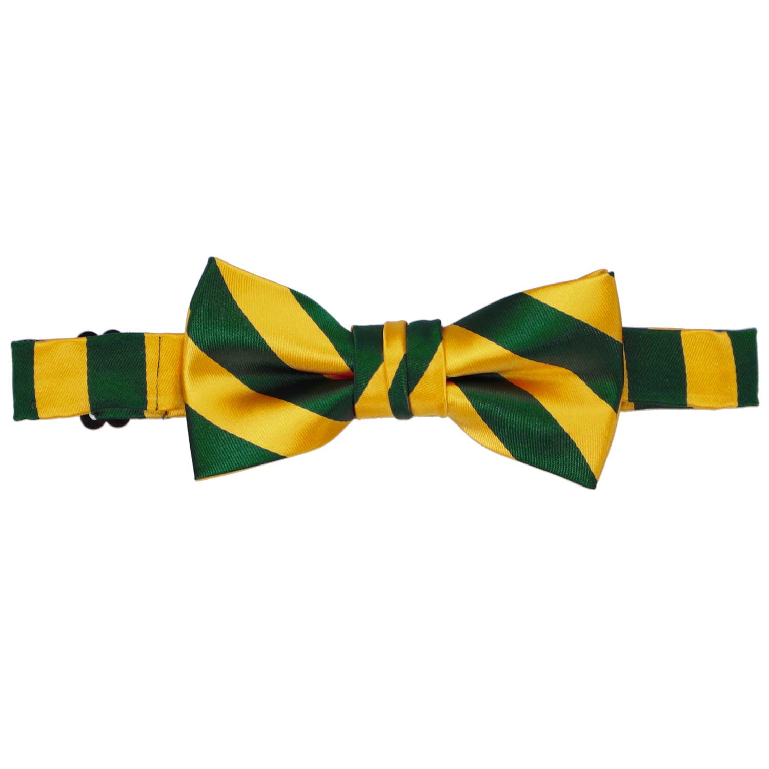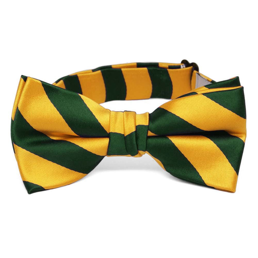 We designed this boys' hunter green and golden yellow striped bow tie to coordinate with our popular men's striped ties and bow ties. At 0.5-inches, the stripes are slightly skinnier than the men's size to be more proportionate for a child. The bow is pre-tied with a band collar sized for most boys from baby to 10-years old.