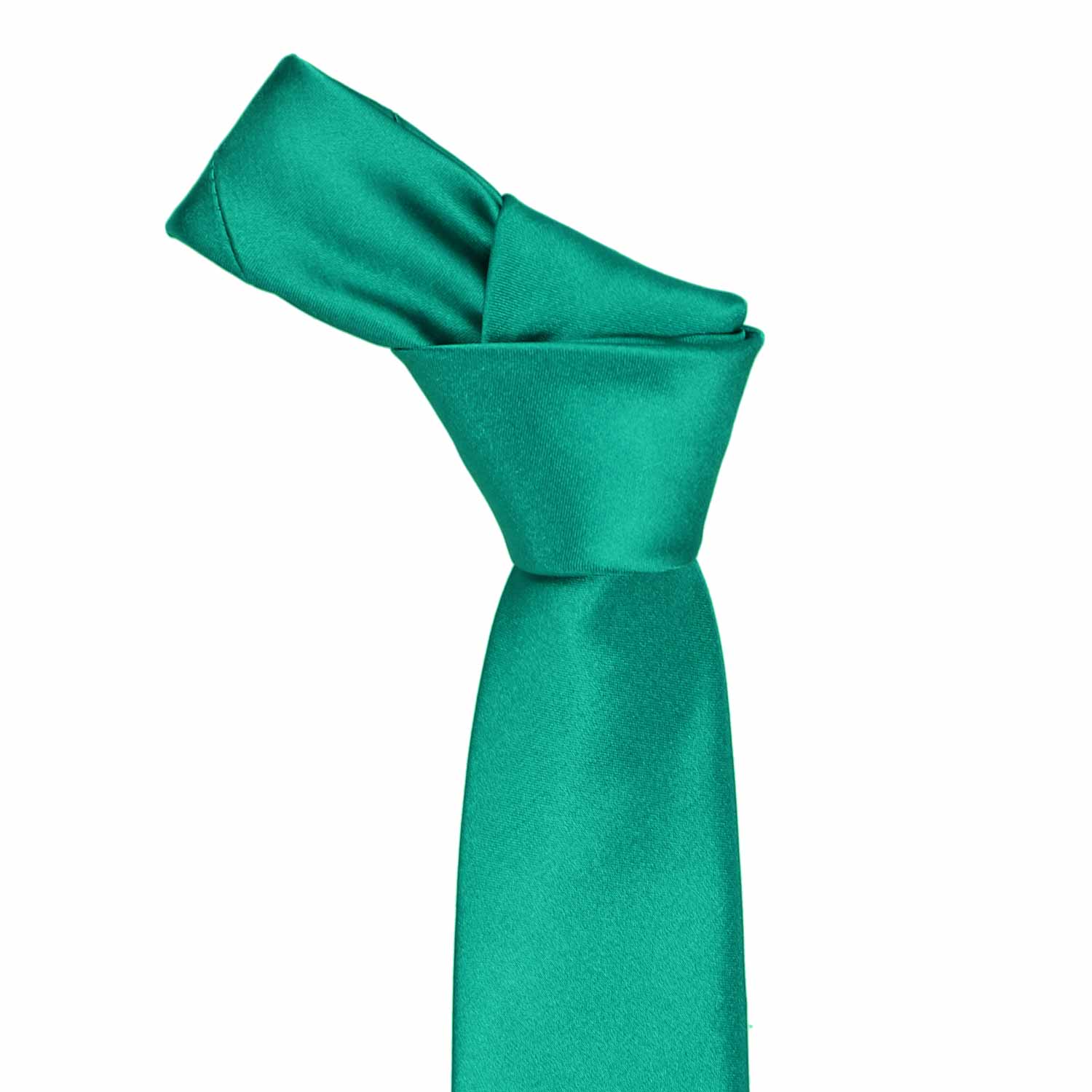 This jade tie features a 48 inch length and 3 inch width. On those 8 to 13 years old, it will look like a traditional tie. The material is soft, silky and finished with a shiny satin sheen.
