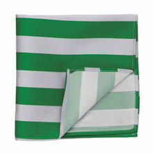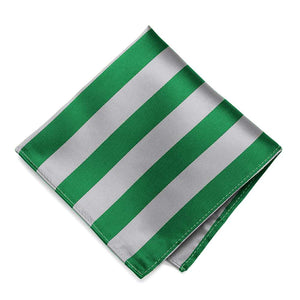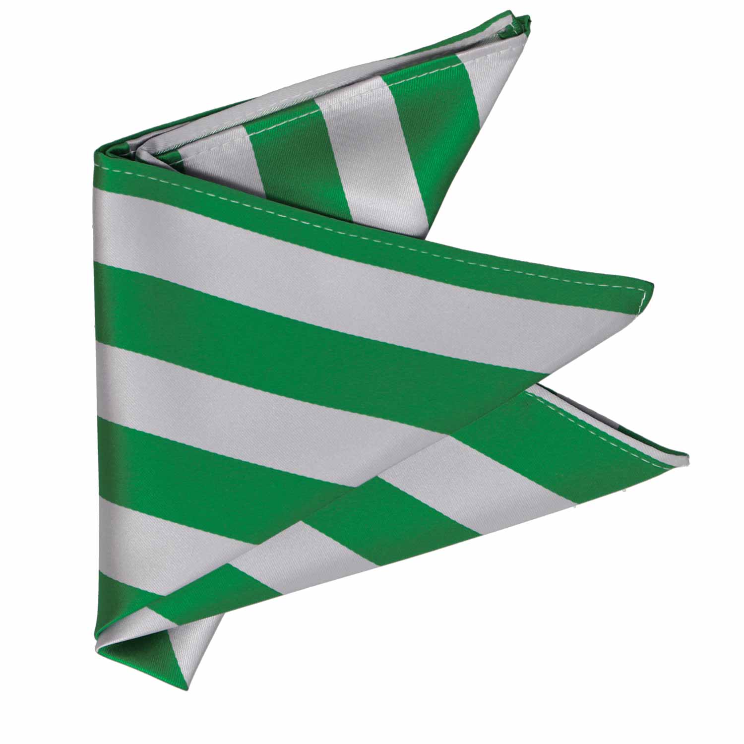 This kelly green and silver striped pocket square measures a large, 12-inches by 12-inches to suit a wide variety of folds. The tightly woven material creates a smooth finish for a sharp look. Matches our kelly green and silver striped ties, bow ties and boys' sizes.