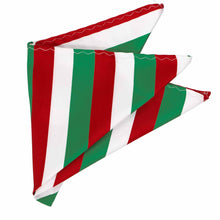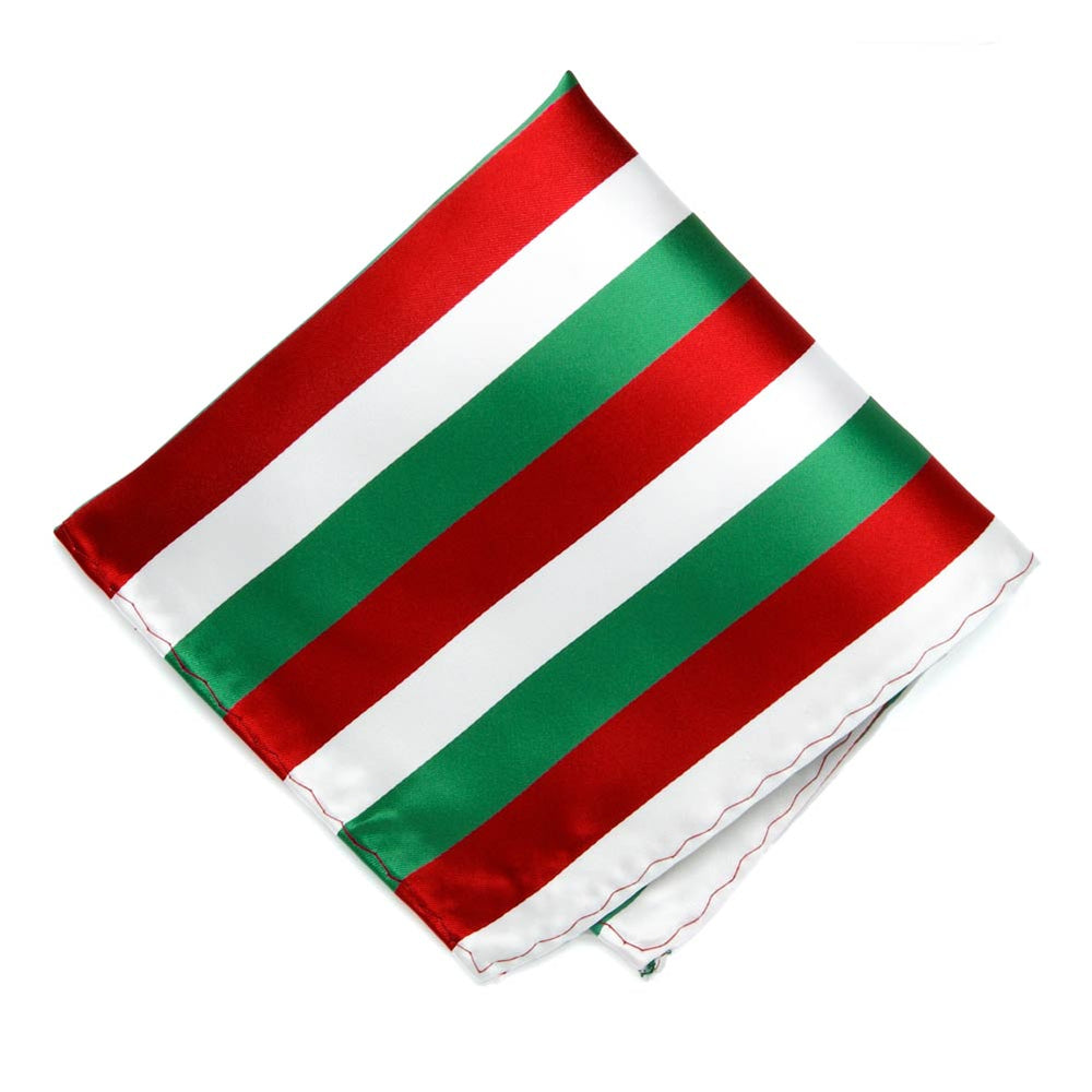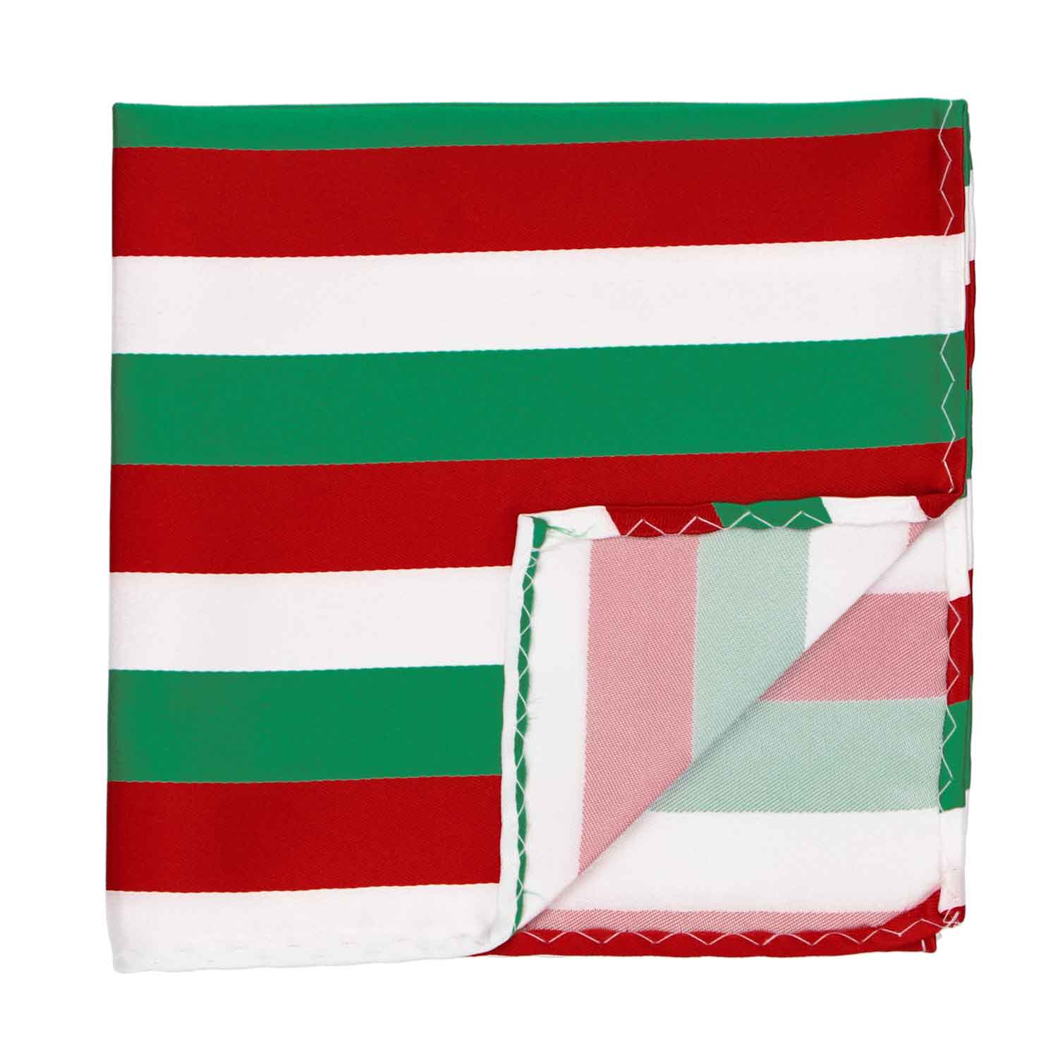 Merry Christmas! ¡Viva México! Viva L'Italia! This versatile kelly green, white and red striped pocket square measures a large, 12-inches square to suit your favorite folds. The tightly woven material creates a smooth and sharp finish. Matching ties and bow ties in stock.
