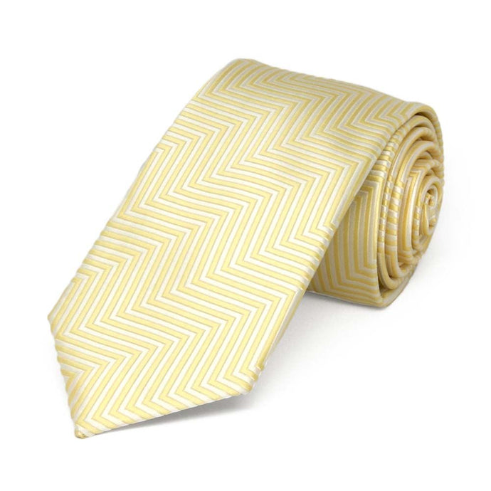 Rolled view of a light yellow and white chevron pattern slim necktie