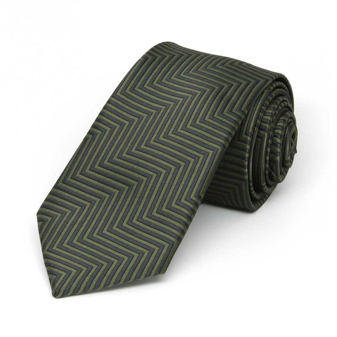Dark green and sage green chevron striped tie, rolled to show texture and pattern