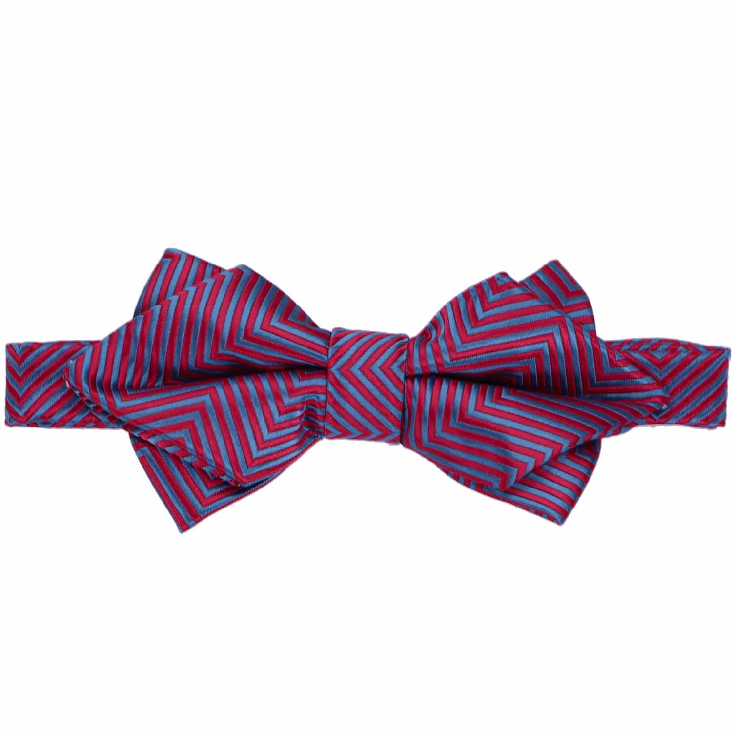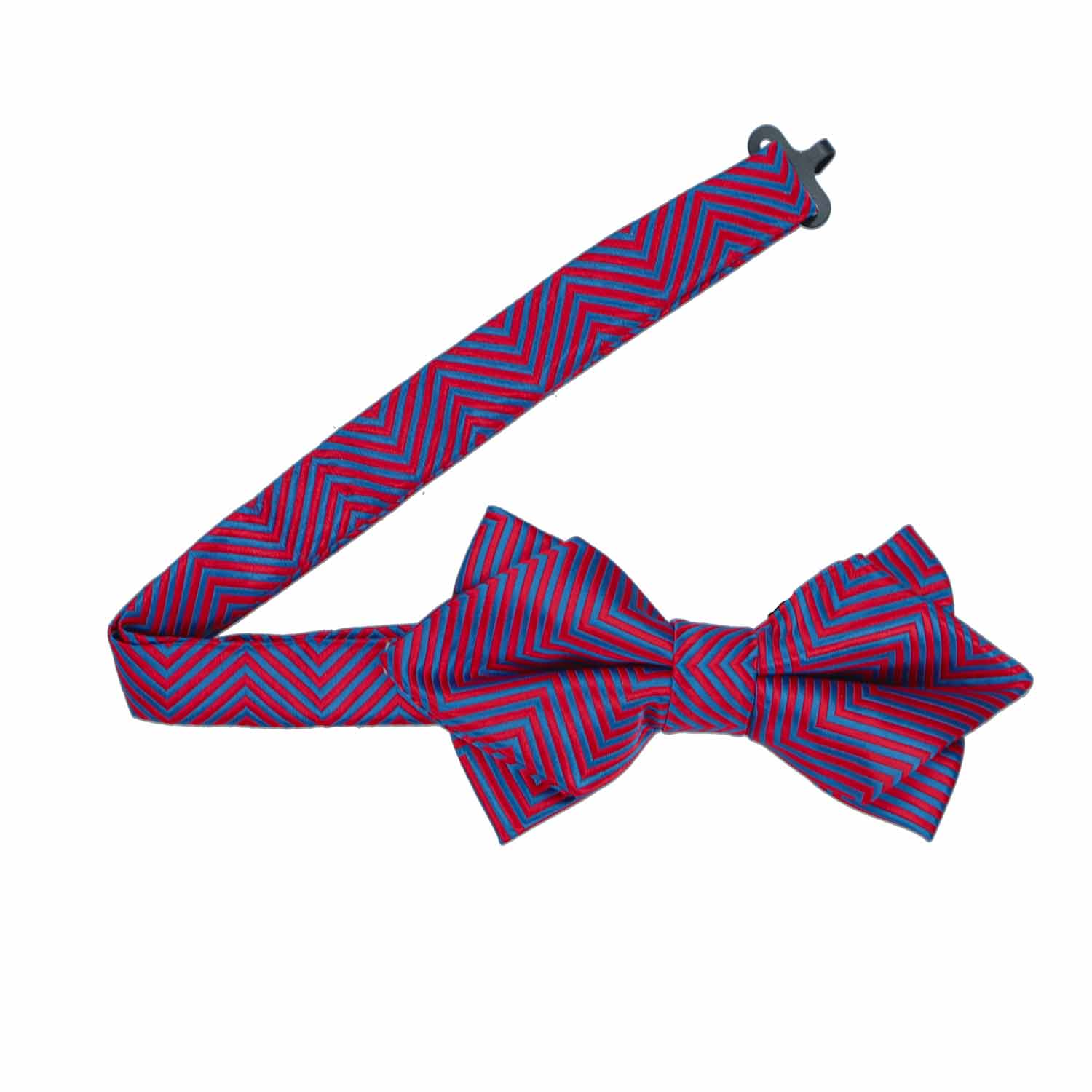 This sleek red chevron striped diamond tip bow tie is the ideal accessory for the modern businessman. Featuring a refined skinny chevron stripe design, it adds a bold yet sophisticated touch to any professional ensemble. For a perfectly coordinated look, matching pocket squares are also available in the same pattern. Pair it with a navy blue suit for a standout appearance at your next meeting and make a lasting impression with this stylish and convenient accessory.