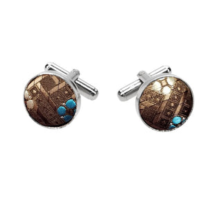 Here's a great pair of cufflinks to add to your accessory collection. This fabric pattern features a brown and turquoise flower-like design. The pattern is subtle and will easily match ties in your wardrobe. (If you're wearing a suit, try these with navy blue or brown/tan suits.) The fabric is attached to a silver-tone backing.