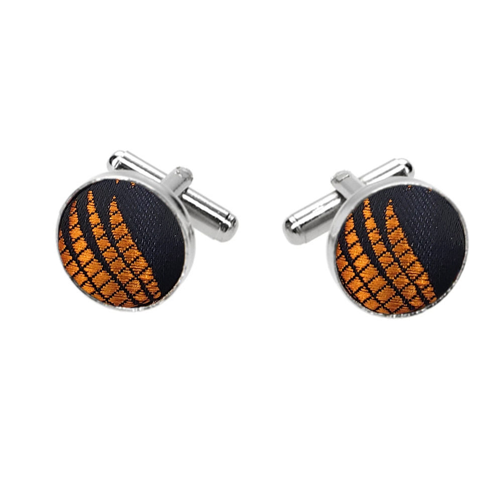 Here's a fun pair of cufflinks to add to your outfit. The orange and black torch-like pattern is made from fabric. We've placed it on a silver-tone backing to give it a stylish, designer look. Simple to use and easy to match. Wear these to work, set your wedding day outfit on fire or give these as a gift.