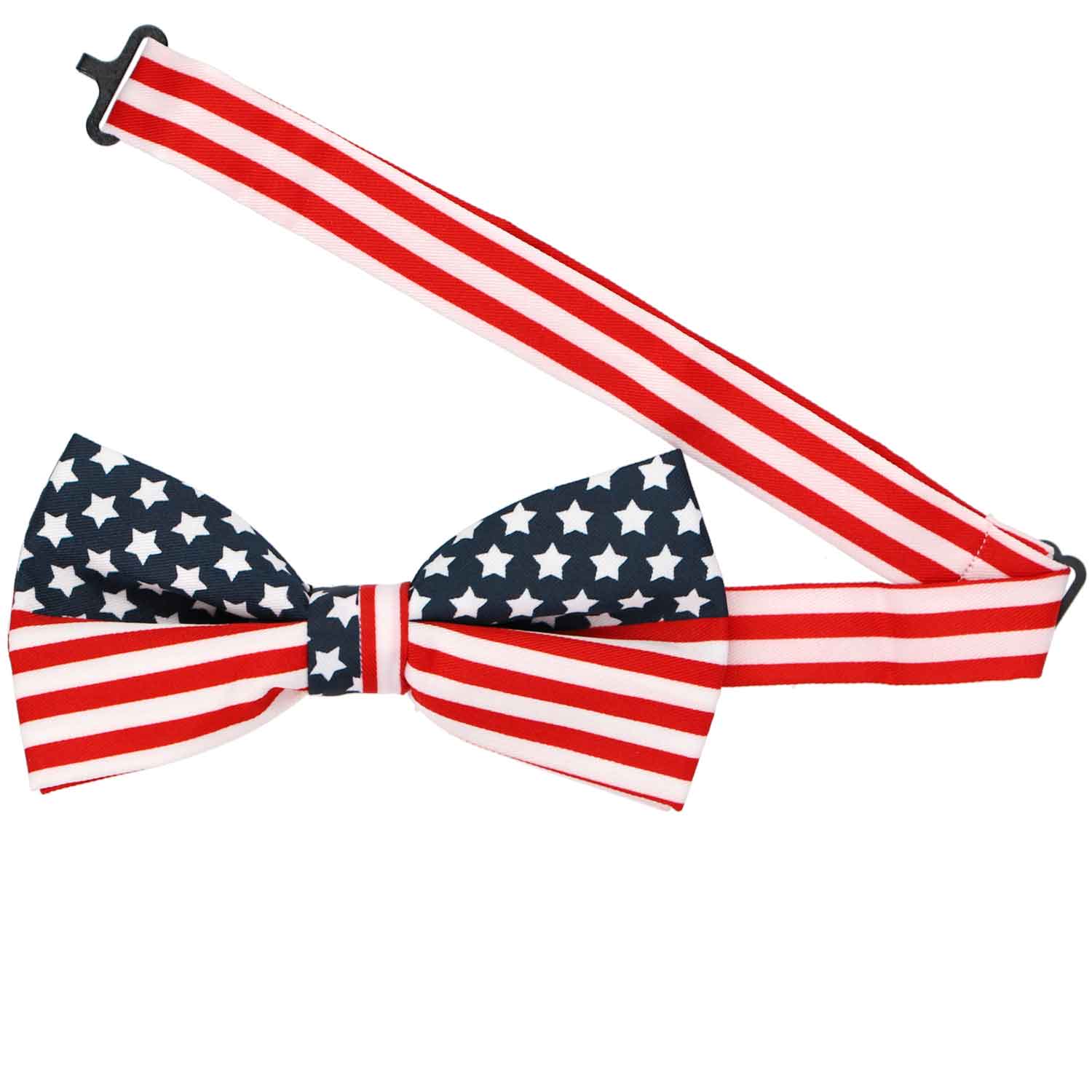 A favorite for July Fourth! This men's bow tie is spangled in red, white and navy blue stars and stripes for a fun and patriotic American flag look. This is a pre-tied bow tie featuring an adjustable band collar that expands to fit most neck sizes (but officially it goes up to 20 inches).