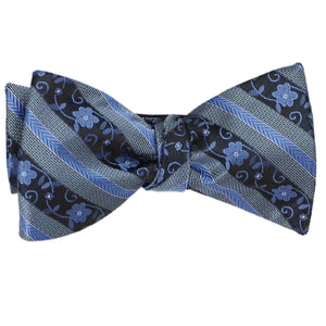 Add a touch of style with this brilliant blue floral striped self-tie bow tie! Featuring an alternating floral vine and textured stripe pattern, it strikes the perfect balance between classic and contemporary. The self-tie design allows for a personalized fit, making it ideal for weddings, spring events, or everyday wear when you want to stand out. Pair it with a crisp white shirt and a navy or gray suit for a polished, modern look.