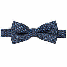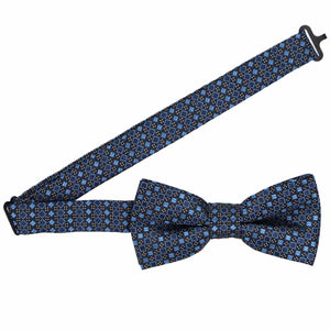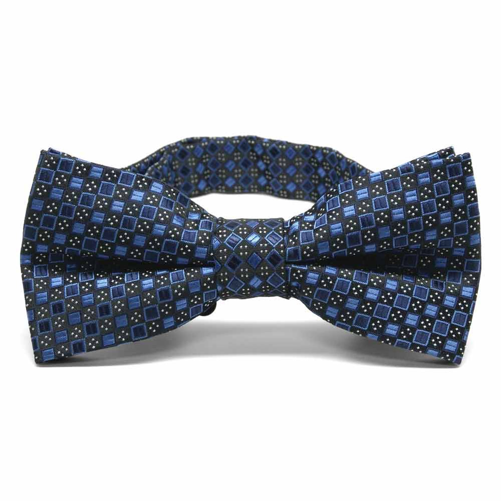 Blue and black square pattern bow tie, close up front view