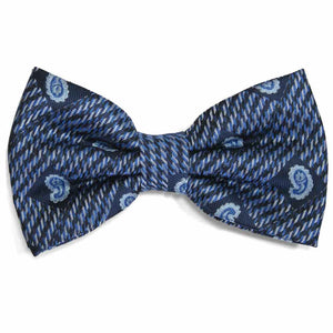 A special purchase bow tie, available while supplies last. This dark blue paisley pattern bow tie is made from heavyweight woven material. Great for a bold, everyday look. The bow tie is pre-tied with a band collar that expands to fit most adults.