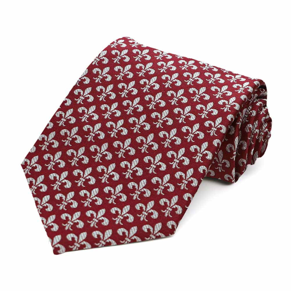 This fleur-de-lis tie will add a regal look to your outfit. With Mardi Gras in mind, fleur-de-lis can often be a bold and colorful pattern these days. Here, we went conservative with shades of burgundy and gray. This tie is a great choice for the office or an upscale Fat Tuesday event.