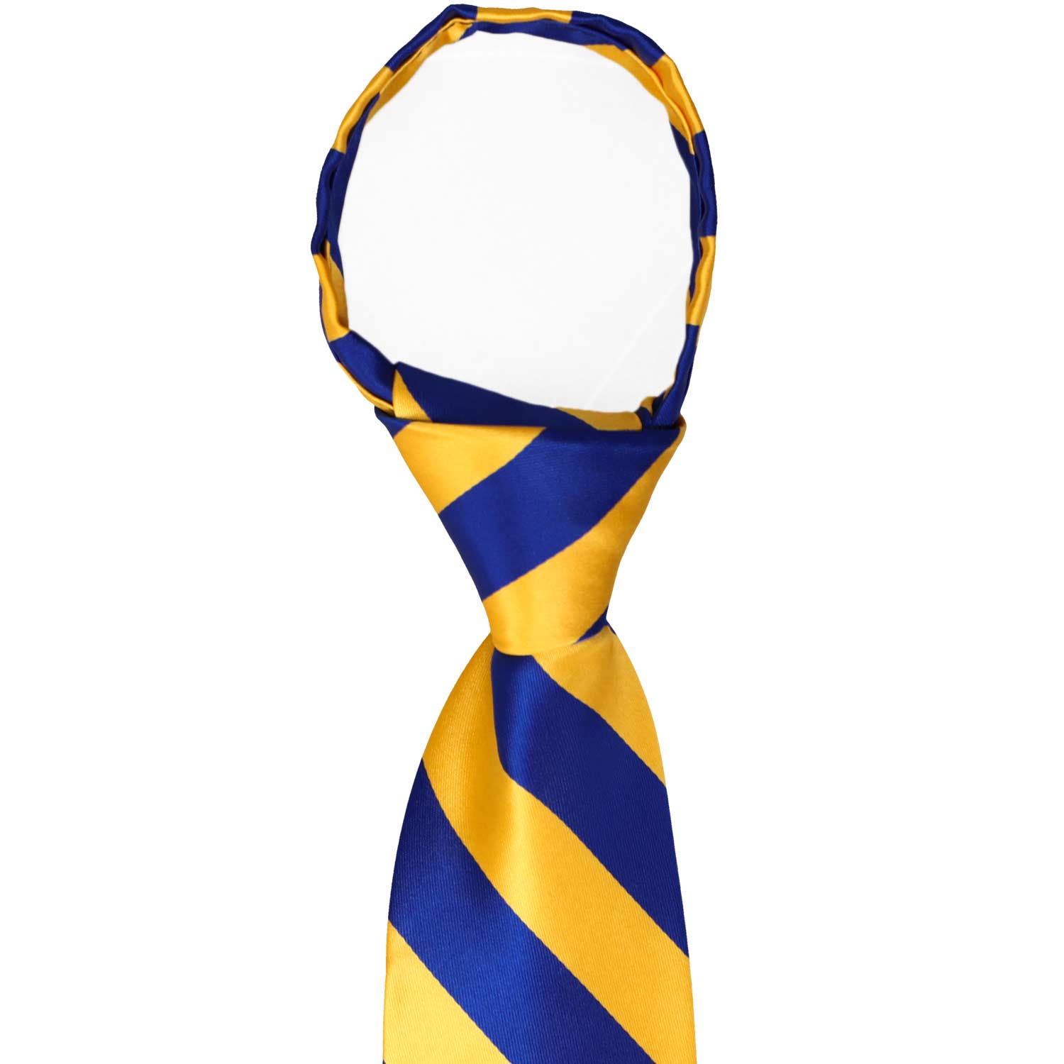 Support your school or cheer on your favorite team with a royal blue and golden yellow striped tie. It's pre-tied and easy to use, but when worn it will look just like a standard necktie. The secret is a zipper in the tie tail that allows the collar to quickly expand and fit over the head without having to tie a knot. Available in a standard men's 20-inch length or 17-inch length for shorter men, women and teens.