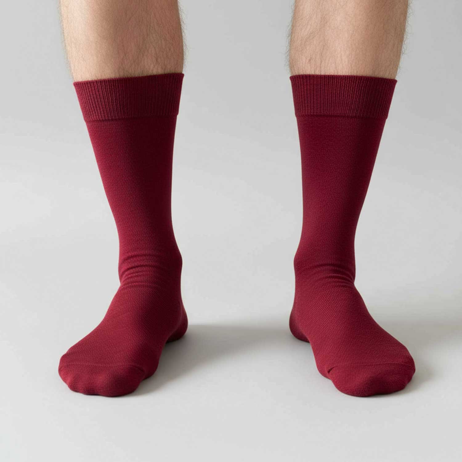 Burgundy socks are easy to match. We consider burgundy a new neutral and find that the color goes with almost everything. These socks will look good with most suit colors, including navy blue, gray, black and tan.