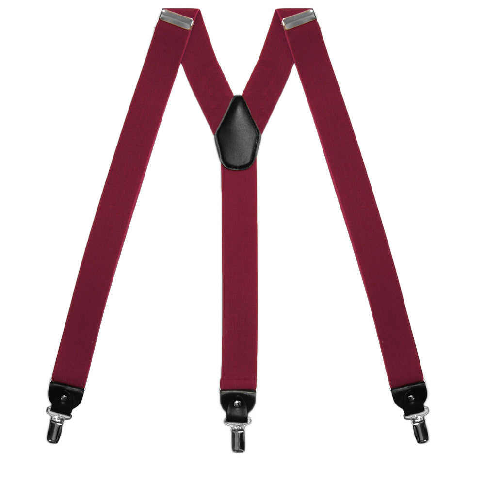 These burgundy suspenders are perfect for everyday or formalwear. They are adjustable from approximately 35 to 50-inches to fit most men and hold securely in place with three silver-tone clips. Y-back design with a black crosspatch and clip tabs.