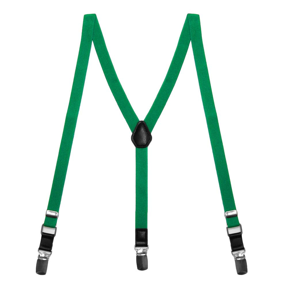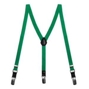 These fashionable green suspenders are the perfect way to add color to your outfit. The skinny, half-inch strap size is fun and trendy! We recommend wearing these with a bow tie or skinny tie, and we have matching ones available for purchase. These green suspenders can be worn for formal and casual occasions. Wear them on their own or under a suit jacket for a pop of color.