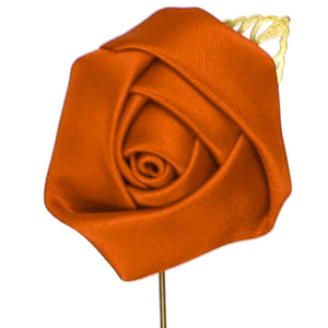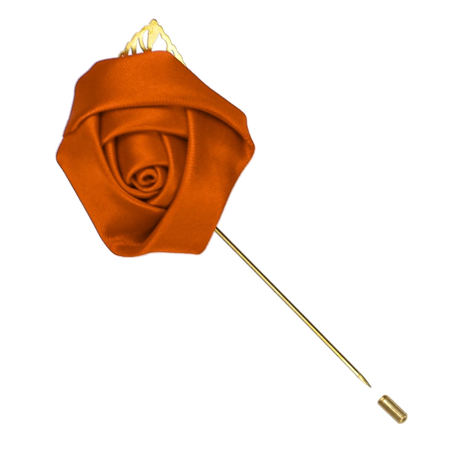 Complete his wedding day look with this burnt orange flower lapel pin. These lapel pins are a budget-friendly alternative to the boutonnière. The floral puff is made from the same material as our premium ties and is accented with a gold-tone leaf. It secures to his jacket, vest or suspenders with a metal pin.