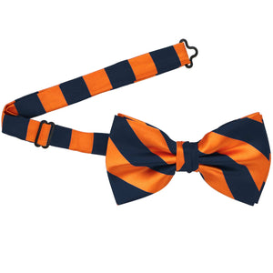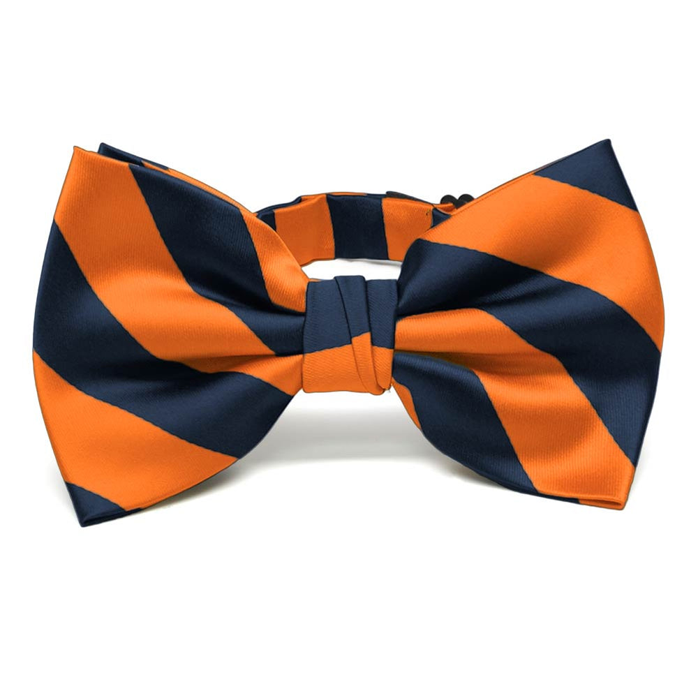 This navy blue and orange striped bow tie features a pre-tied, band collar that expands to fit neck sizes up to 19-inches. Made from all polyester microfiber, it is designed to match our bestselling men's navy blue and orange striped tie. Matching pocket squares and boys' sizes are available for purchase.