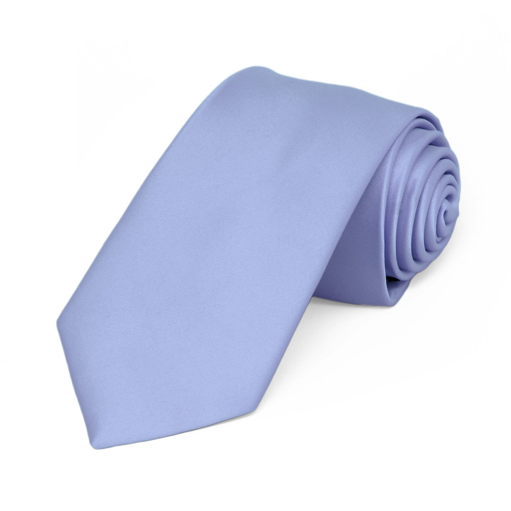 This periwinkle slim tie is the perfect mix of blue and purple. The soft shade is a favorite for wedding parties and spring events. The color looks great with fitted gray or tan suits. (Or, bring out the purple tones by pairing it with a navy suit.) This color is also available in a wider width necktie and pocket squares, so it's easy to mix and match styles among a group.