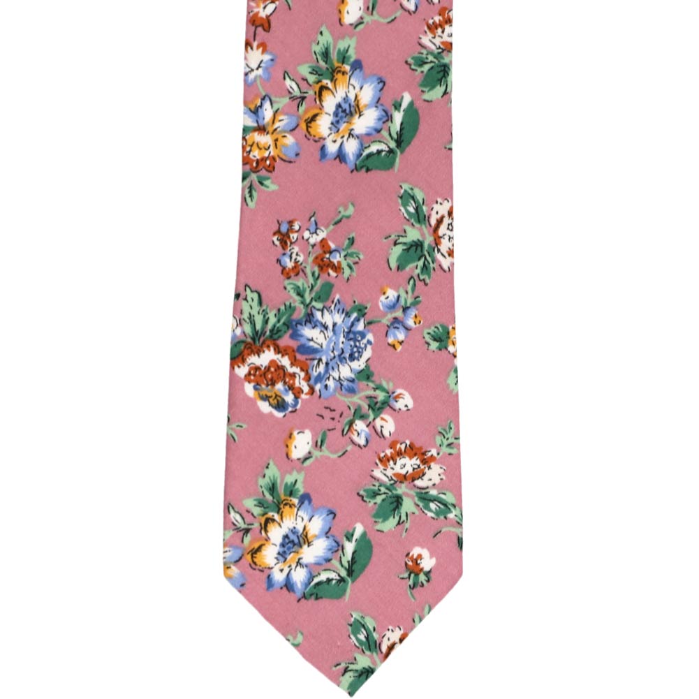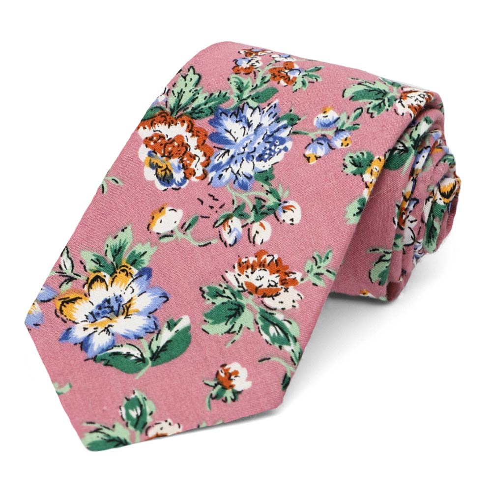 For couples seeking a unique look on their wedding day, this mauve floral tie is the perfect choice. Featuring large blue, burnt orange, and green flowers on a dark mauve background, this tie offers a bold and sophisticated alternative to traditional wedding ties. Ideal for everything from fall weddings to garden celebrations, this one will look great suited up or with more casual suspenders-and-slacks groomsmen attire.