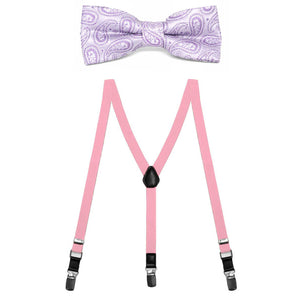 Is it time to get dressed up yet? Because we can’t wait for your little guy to wear this charming bow tie and skinny suspenders set! It combines our boys’ thistle purple Darlene paisley bow tie with a pair of pink suspenders. Totally cute and perfect for Valentine’s Day, Easter or any other warm-weather special occasion.