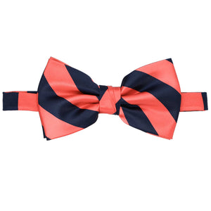 This bright coral and navy blue striped bow tie features a pre-tied, band collar style that expands to fit neck sizes up to 19-inches. Made from heavyweight woven material with a smooth satin finish. Look for this color combo in a men's necktie, skinny tie and pocket square, too.