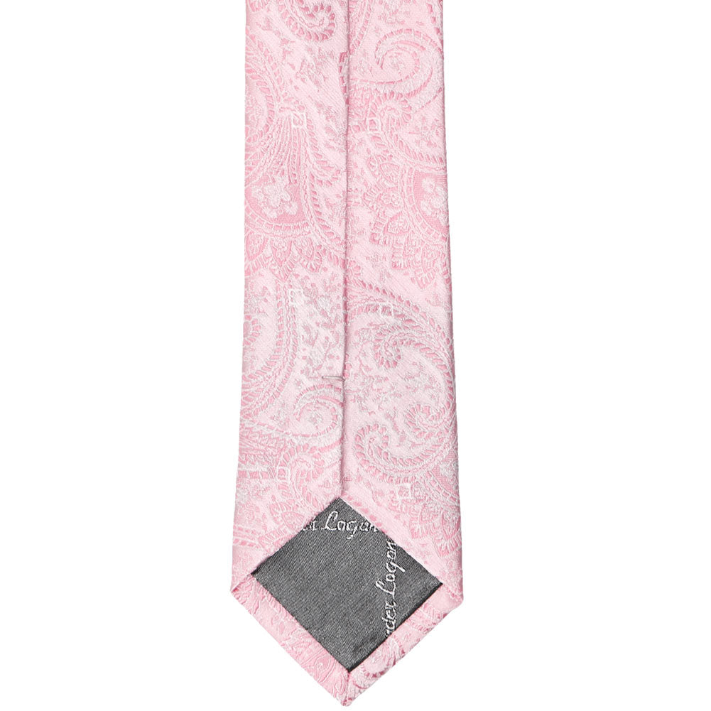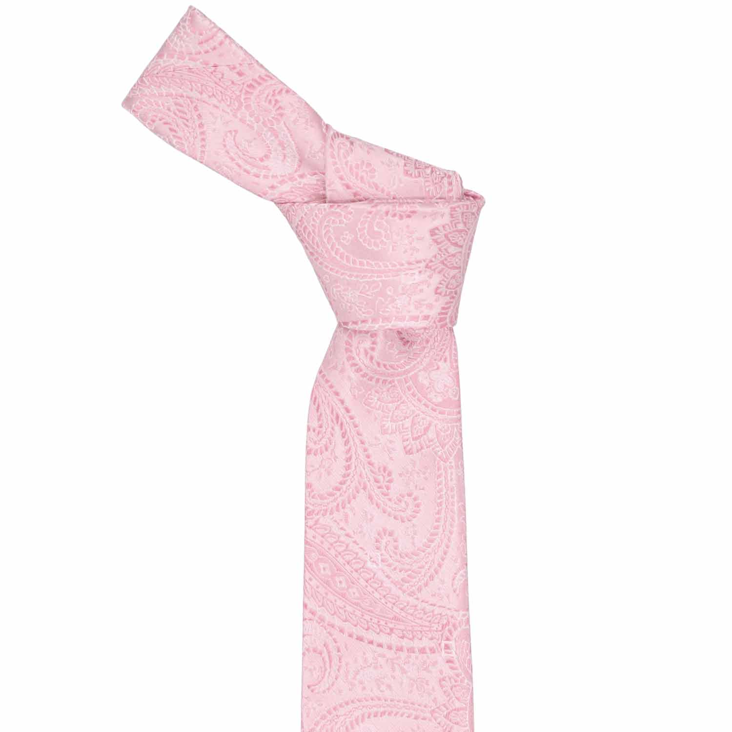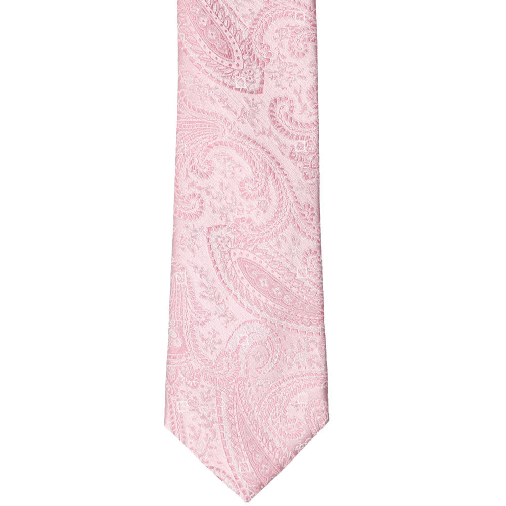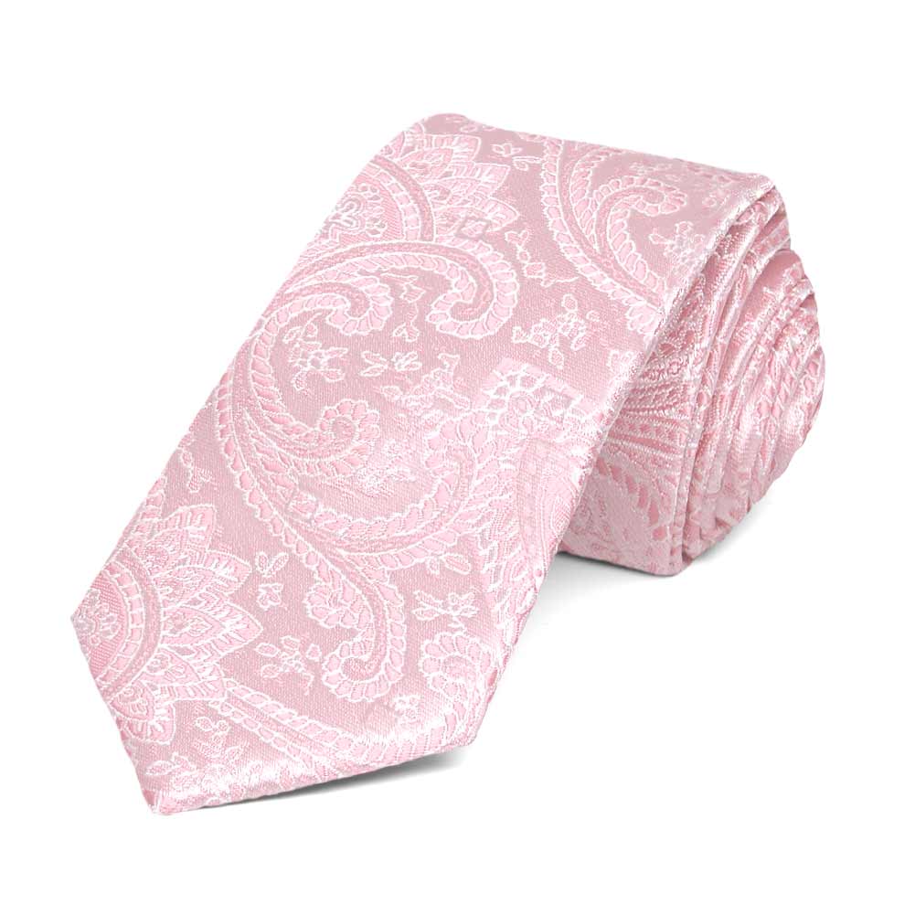 This slim, pale pink paisley tie is the perfect choice for your wedding day. Its soft, tone-on-tone pattern, accented with delicate white stitching, creates a timeless and elegant look. Whether you choose to pair it with the groomsmen's suit color or opt for a sleek suspenders and slacks ensemble, this tie effortlessly complements any style. It's a romantic touch that will make your special day even more unforgettable.
