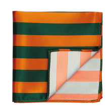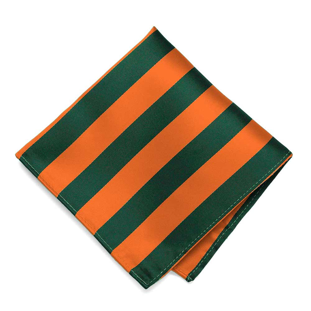 This Florida orange and dark green striped pocket square measures a large, 12-inches by 12-inches to suit a wide variety of folds. The tightly woven material creates a smooth finish for a sharp look. Matching neckties and bow ties available to complete your look.