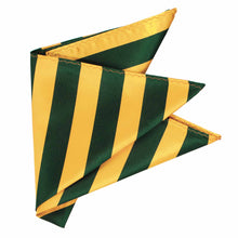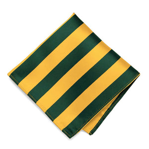 This hunter green and golden yellow striped pocket square measures a large, 12-inches by 12-inches to suit a wide variety of folds. The tightly woven material creates a smooth finish for a sharp look. Matches our hunter green and golden yellow striped ties and bow ties.