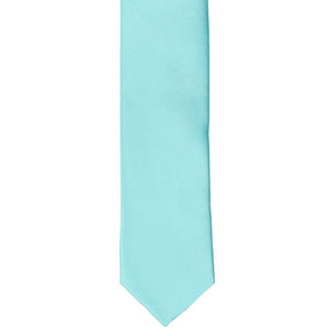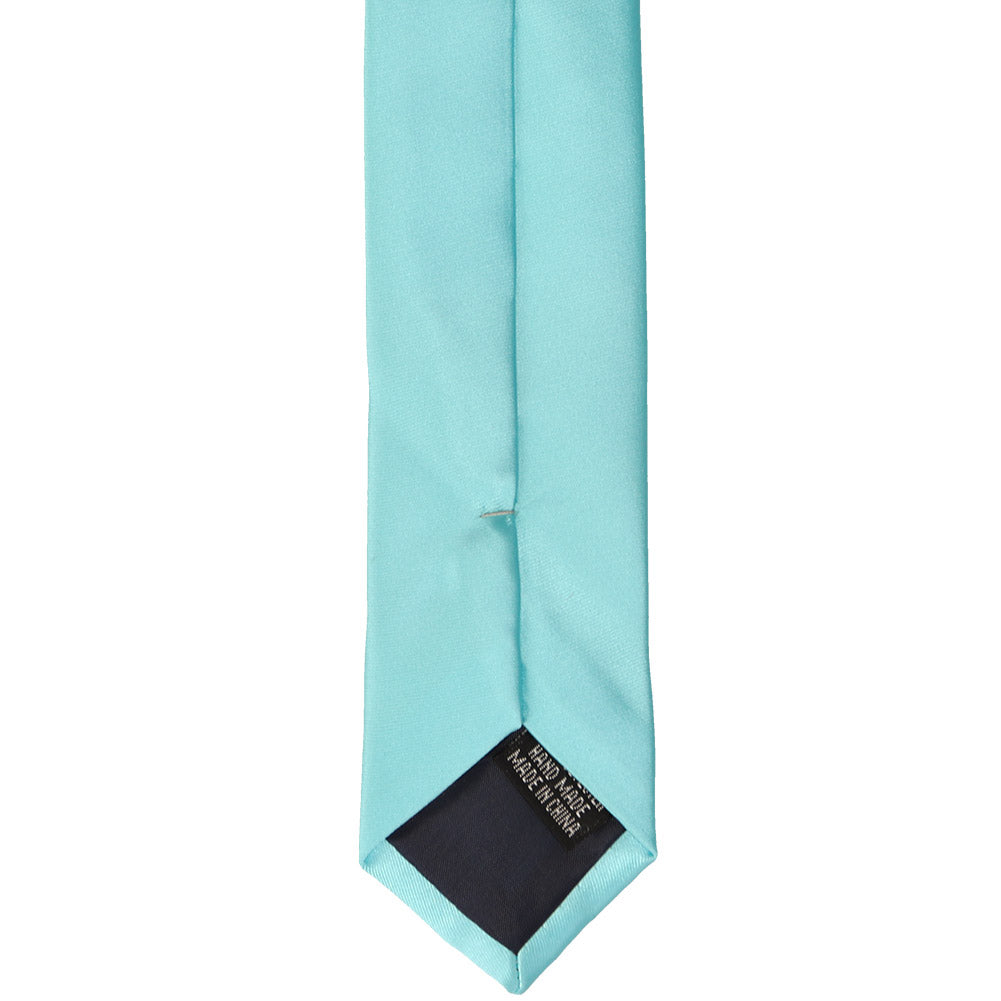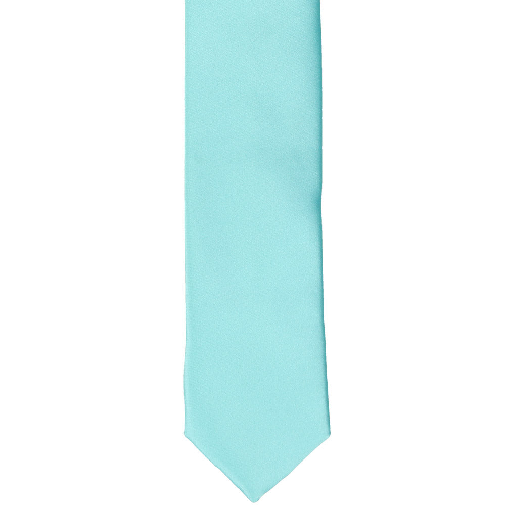 The knot on a pool blue skinny necktie