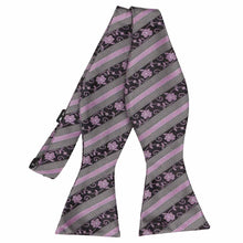 Neatly tied bow on a dark lavender floral striped self-tie bow tie