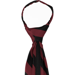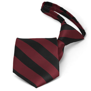 Introducing the latest addition to your personal or uniform wardrobe: A burgundy and black striped zipper tie! This popular color combo is favored by schools and sports teams, but there certainly is no reason why you can't use it to spruce up your work attire. And with its convenient pre-tied design, getting ready has never been easier—just slip it over your head and tighten for the perfect fit.