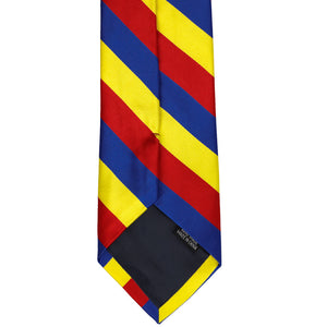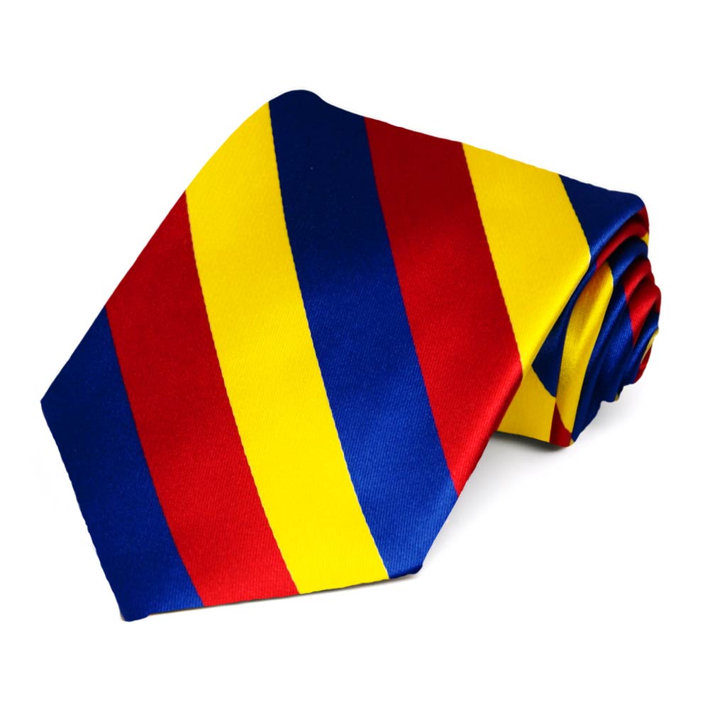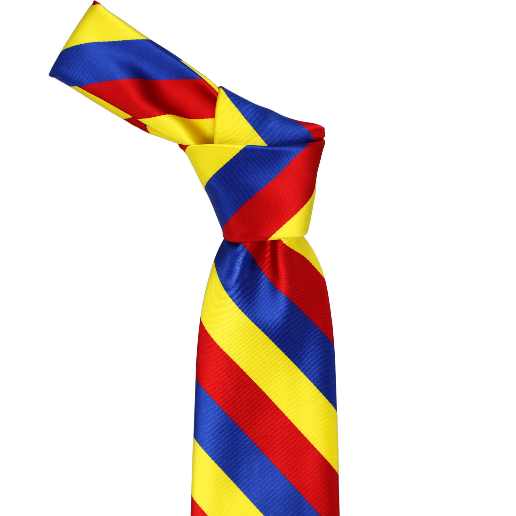 Get ready to turn heads when you put on this tri-color striped tie. The primary color palette is eye-catching in red, royal blue and yellow. Despite the bold look, it’s easy to match. Try wearing this tie with your favorite black or navy blue suit. For a relaxed look, wear it with your favorite dark denim.