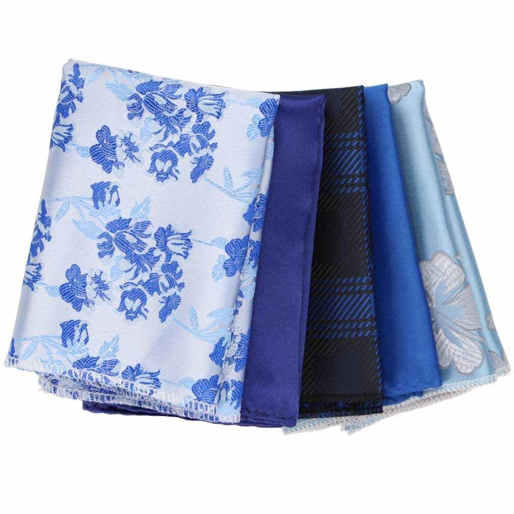 Round out your pocket square collection with this 5-pack of blue pocket squares. We select the patterns for you, which includes a healthy assortment of paisleys, florals, solids and more. The light and dark shades of these pocket squares will easily coordinate with your favorite navy, tan and gray suits.