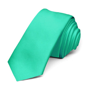 This misty teal skinny tie is bright and trendy. It's cut to our skinniest, 2-inch width with a standard men's length. The material is heavyweight woven polyester with a light satin finish, so it's not too shiny, not too dull.