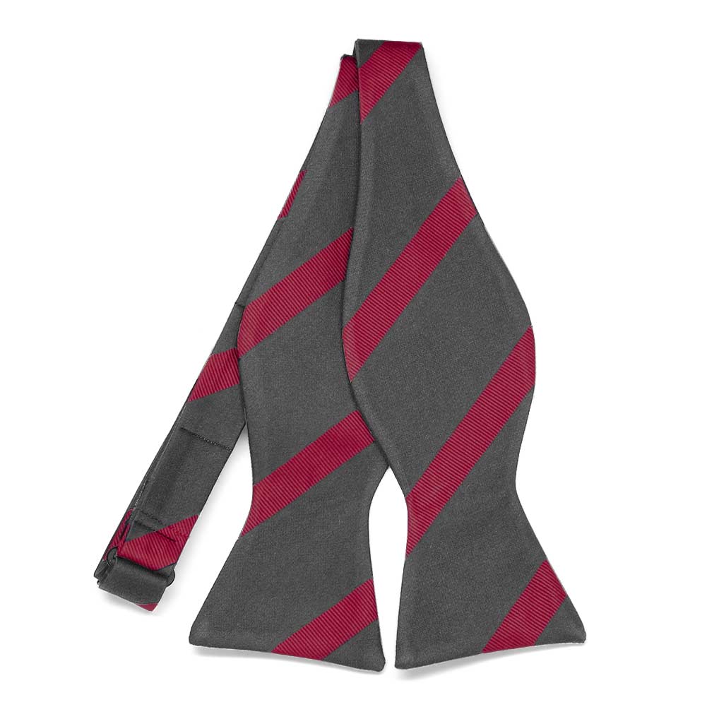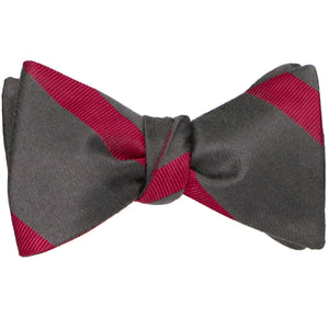 Get ready to look sharp in this dark gray and red striped self-tie bow tie. It’s a great choice for matching your school or company colors. Wide collegiate stripes feature a soft, smooth finish while the thinner ribbed stripes add texture. Try wearing it with a crisp white button down and slacks or your favorite suit.