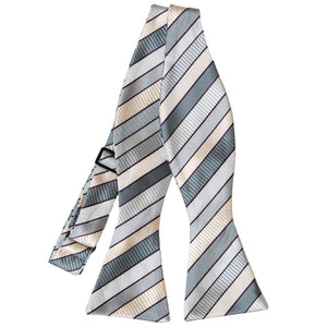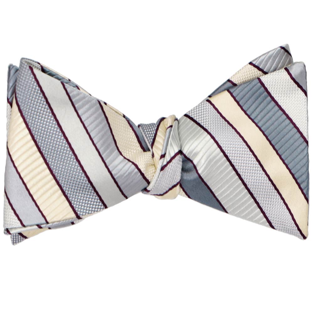 Enhance your attire with this light silver self-tie bow tie, featuring a refined textured stripe design and a versatile neutral color palette. Its sophisticated yet timeless appeal makes it the perfect accessory for both casual and formal occasions. Whether paired with a gray or navy blue suit, it adds an effortlessly polished touch to your look. Ideal for daily office wear or special events, this bow tie exudes understated elegance. Complete the ensemble with the matching pocket square for a truly distinguished finish.