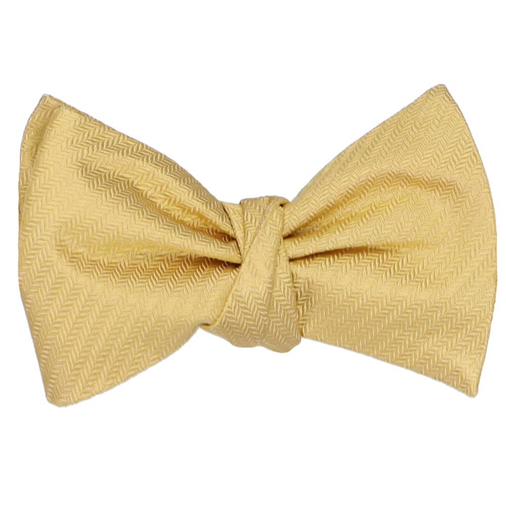 A self-tie bow tie, tied, in a pale gold herringbone pattern