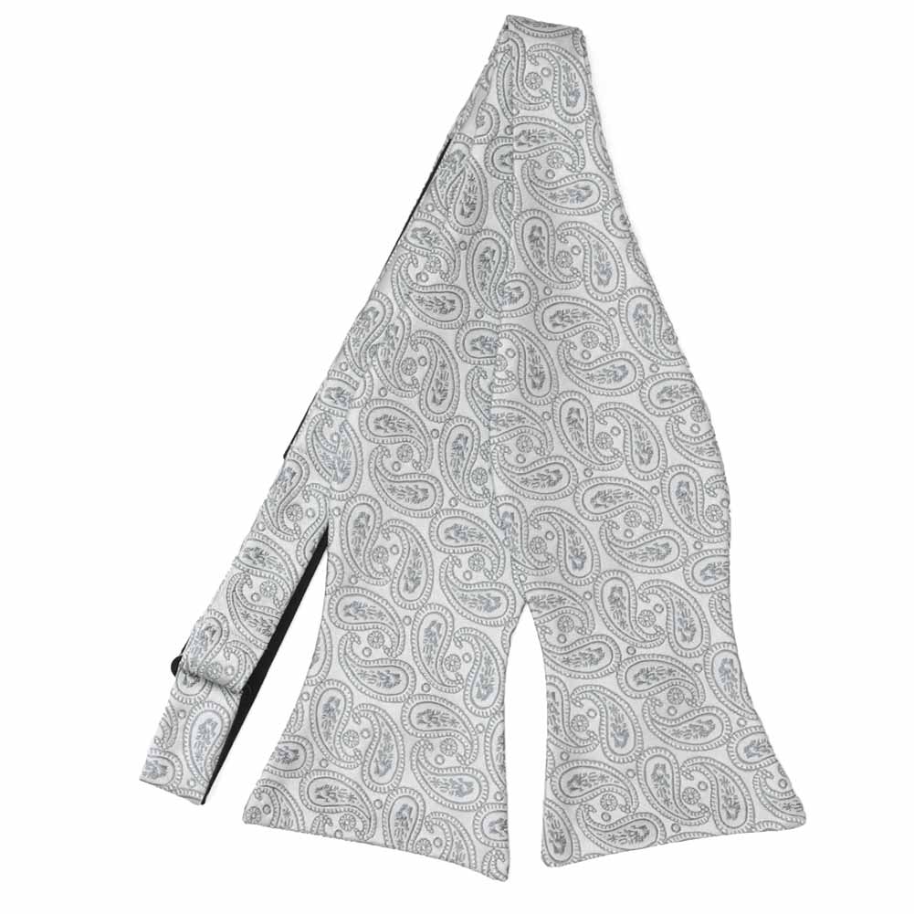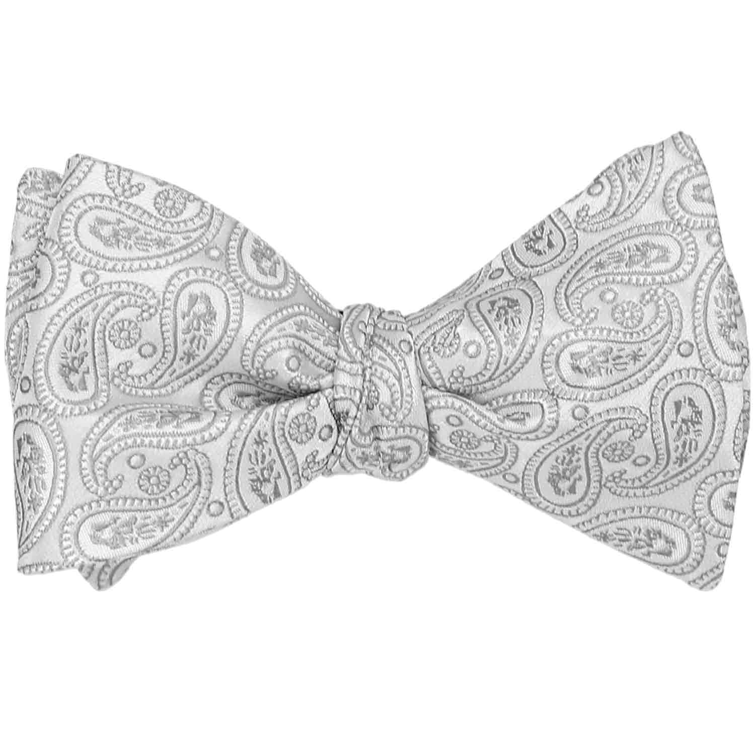 The intricate, tone-on-tone silver paisley pattern of this self-tie bow tie adds a touch of timeless elegance, making it a versatile accessory for any occasion. Whether paired with a black, navy, or dark gray suit for a sophisticated formal look or worn with gray or black dress pants and a crisp white shirt for a more relaxed yet polished ensemble, this bow tie brings effortless refinement. For an extra touch of class, complete your look with the matching pocket square, perfect for weddings, galas, or other special events.