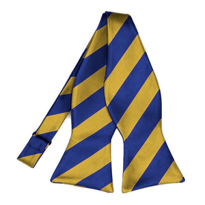 This classic, royal blue and gold striped self-tie bow tie measures approximately 4-inches across by 2.5-inches high when tied. The adjustable neck fits sizes from 13.75 to 20-inches. Made from all polyester microfiber, it is designed to match our bestselling men's royal blue and gold striped tie. Matching pocket squares are available for purchase.