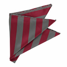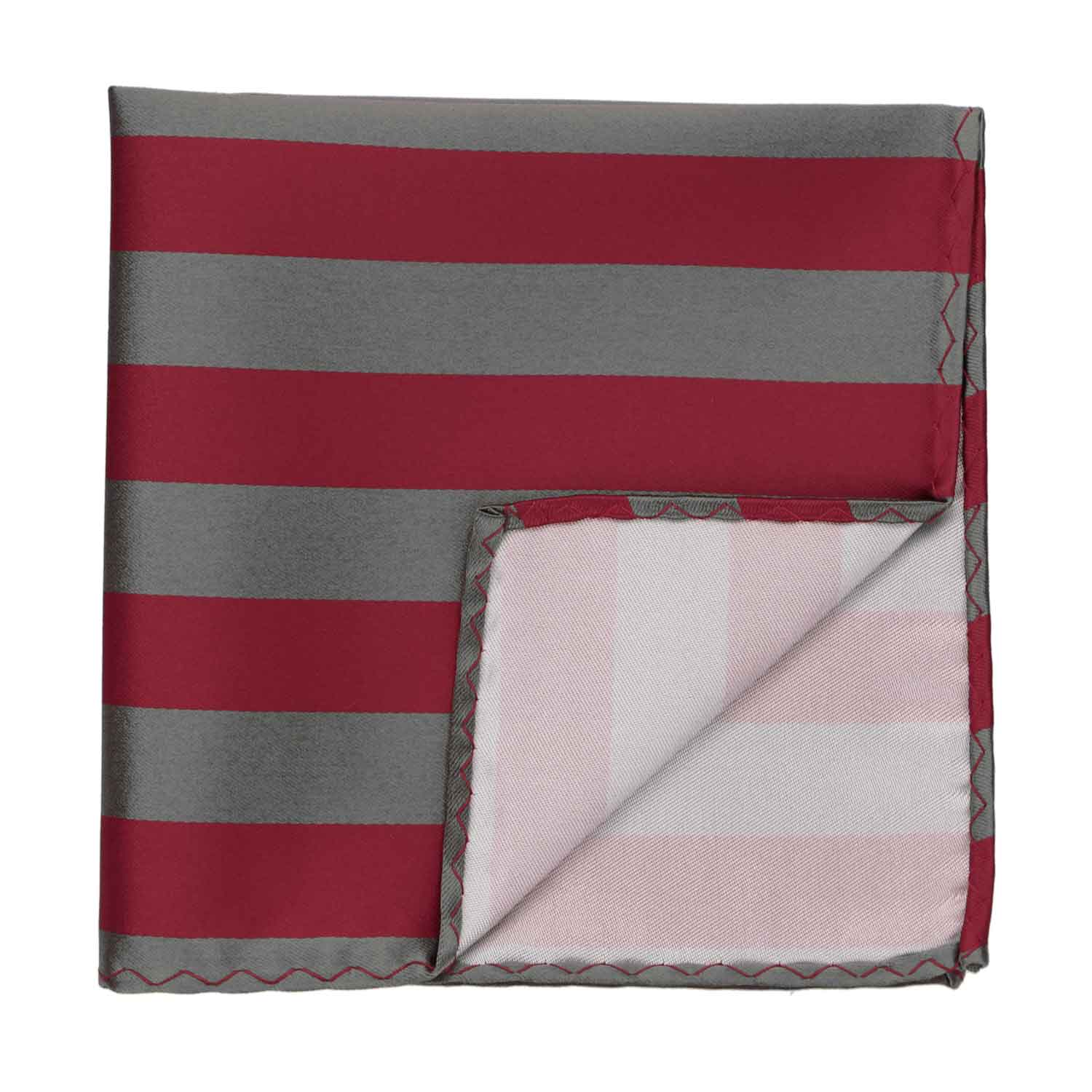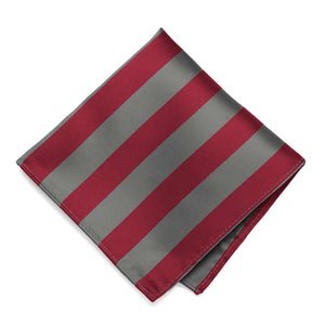This crimson red and medium gray striped pocket square measures a large, 12-inches by 12-inches to suit a wide variety of folds. The tightly woven material creates a smooth finish for a sharp look. Matches our crimson red and medium gray striped ties and skinny ties.