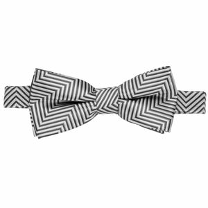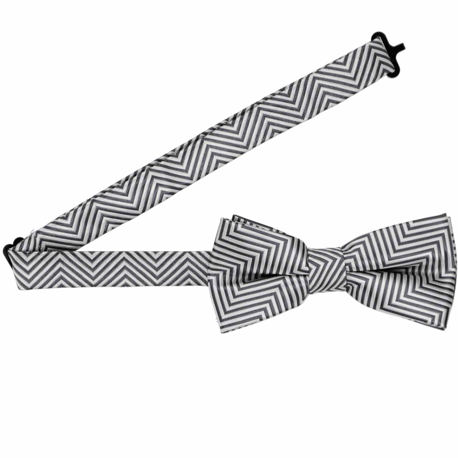 A classy pewter and white chevron pattern bow tie is the perfect accessory for eye-catching formal attire. Its sophisticated color combination adds a refined touch, making it ideal for high-impact occasions such as New Year's Eve, where pairing it with a tuxedo makes a bold statement. The timeless design also complements black, gray, or navy blue suits, effortlessly transitioning from casual to formal looks. Add the matching pocket square, and you’ll take your ensemble to the next level.