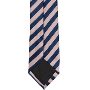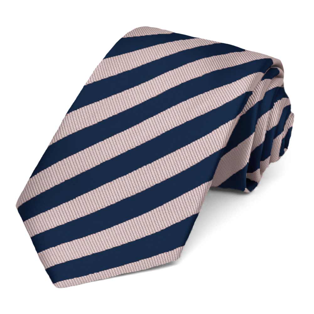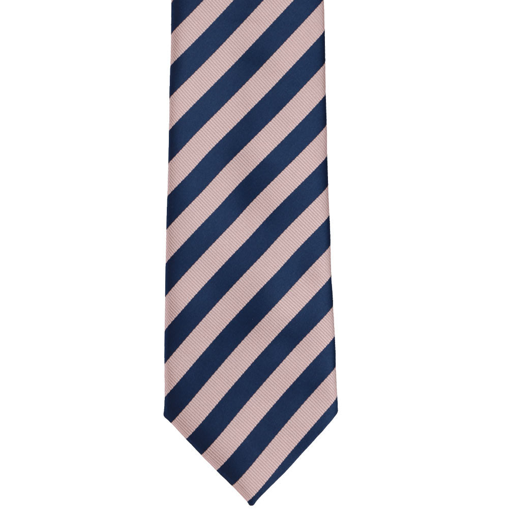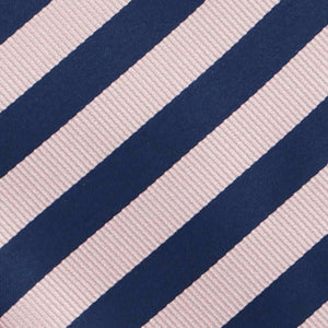 This blush pink and navy blue striped tie is the perfect match for your wedding day. The charming tie features alternating smooth satin stripes and woven ribbed stripes. Those stripes are just the right size to stand out, but still look stylish and elegant. Matching bow ties and pocket squares are available, so you can mix and match tie styles among the groom and groomsmen.